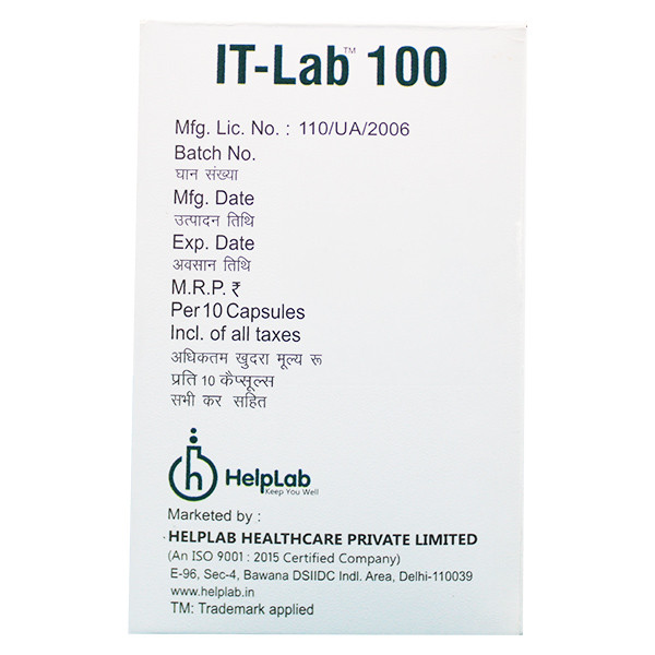 The dose and duration that your doctor has advised for Helplab's IT-Lab 100mg Capsule should be followed. It should be swallowed whole and can be taken with food. If you skip doses, you risk developing infections resistant to subsequent treatment, and the infection may return if you stop the medication too soon. If the infection doesn't go away or worsens, call your doctor.