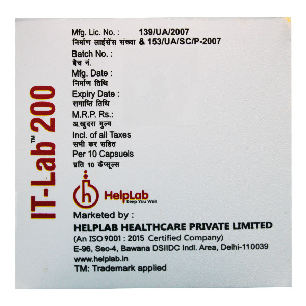 The dose and duration that your doctor has advised for Helplab's IT-Lab 200mg Capsule should be followed. It should be swallowed whole and can be taken with food. If you skip doses, you risk developing infections resistant to subsequent treatment, and the infection may return if you stop the medication too soon. If the infection doesn't go away or worsens, call your doctor.