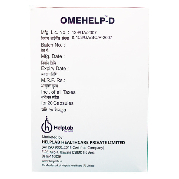 The OMEHELP D CAPSULE from Helplab is a prescription drug intended to treat peptic ulcer disease and gastroesophageal reflux disease (Acid reflux) by reducing symptoms like heartburn, stomach pain, or irritation. It also balances the stomach's acid and encourages simple gastric emptying to relieve stomach discomfort.
